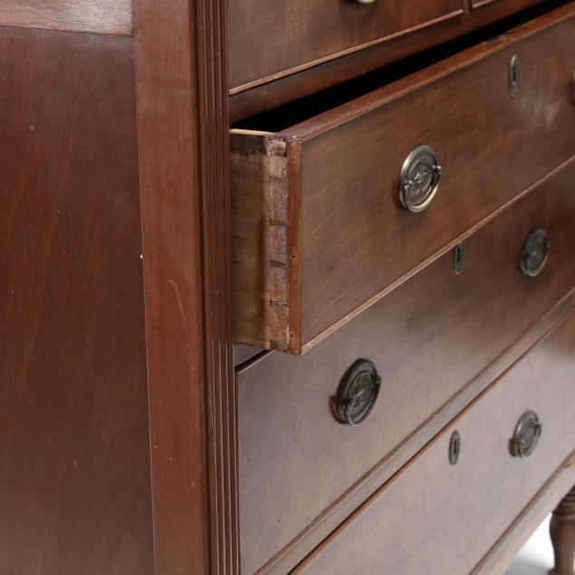 Circa 1830, Maryland or Northern Virginia, walnut and walnut veneer, poplar and white pine secondary, top with applied edge with rear chair rail, two over three graduated drawers, all with cock-beading, applied reeded stiles, paneled sides, base rail with light wood inlaid band, nicely developed ring turned foot.