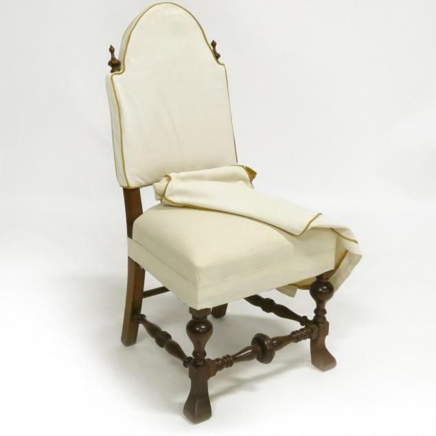 Early 20th century, walnut, two arm chairs and eight side chairs, slip cover seat and back with turned finials and stretcher, raised on Spanish style foot.