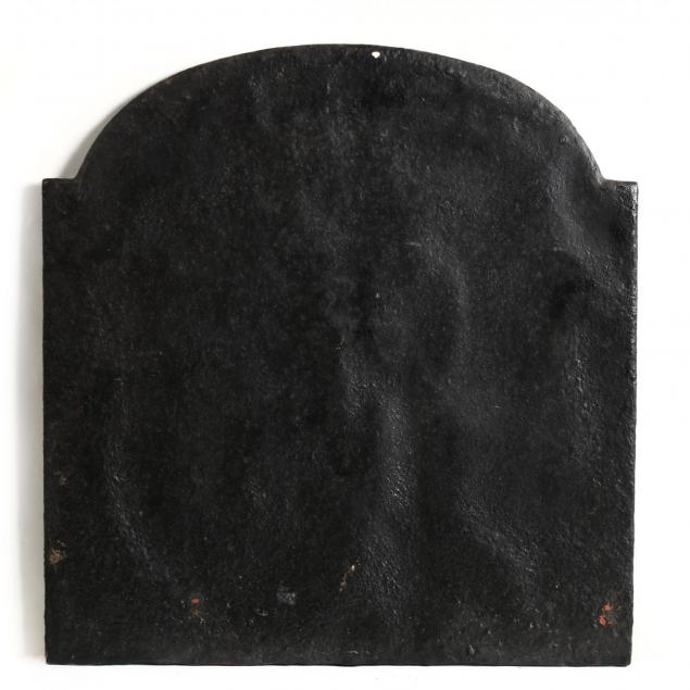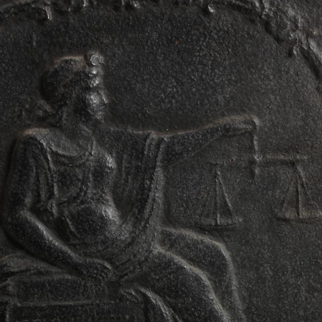 19th century, cast iron, relief decorated of a seated Lady Justice, appears unmarked.