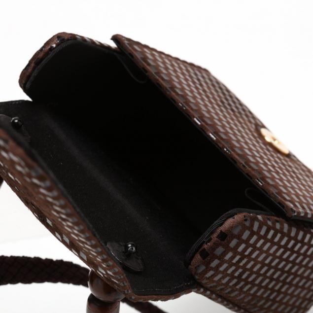 Hand crafted one-of-a-kind embossed suede bag featuring a carved polished stone medallion over the magnetic closure, long polished stone and braided silk strap, open fabric interior.