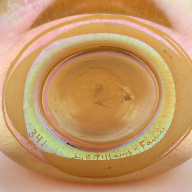 Circa 1900, gold favrile with a pink luster, dimpled decanter with tiered stopper, stems with circular cup and foot, one cup retains original paper label, two cups signed L.C.T., decanter signed "L.C. Tiffany Favrile 341."