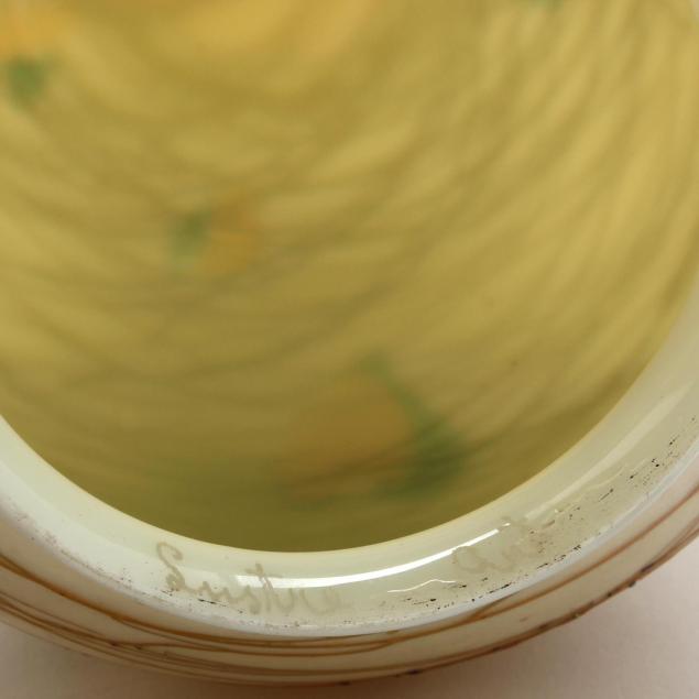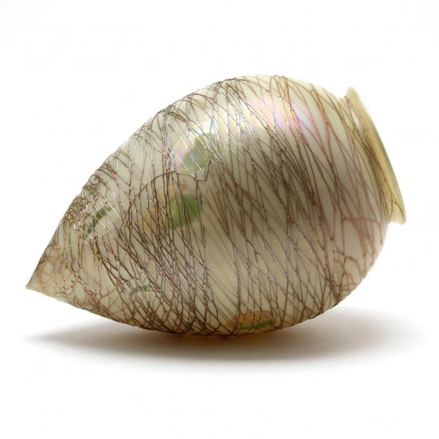 Early 20th century, threaded gold iridescent glass over a white teardrop form shade with vine motif, signed on inner rim "Lustre Art."