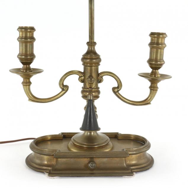 Mid to late 20th century, brass, black linen shade, with snuffer.