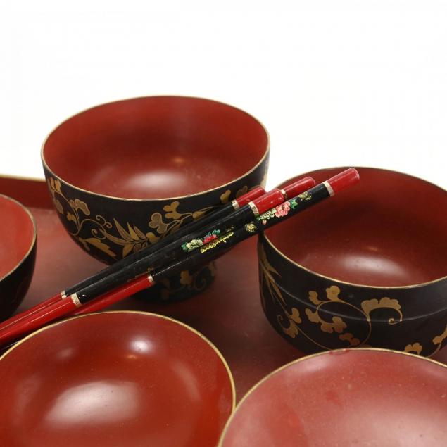Black lacquer table on four raised curved feet with eight lacquer table objects and two sets of chopsticks, red lacquer interior, exterior decorated with flowering vines.