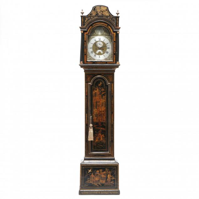 18th century, allover black lacquer with gilt decoration, the hood features a shaped bonnet flanked by finials, the tombstone glass door encloses a repousse brass face with second hand and date dial, engraved ship "William Mortimer Plymouth," conforming waist door, paneled bottom with flush molding. With case key and and key.