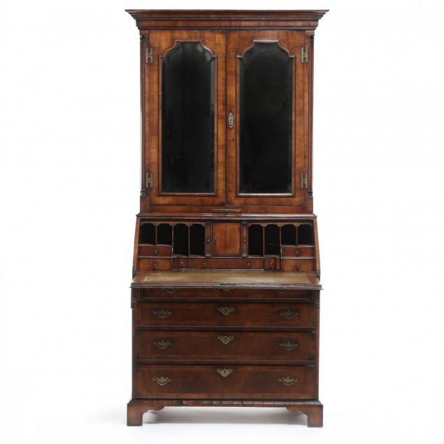18th century, two piece form, mahogany and mahogany veneers, oak and pine secondary, having a cove molded cornice with a vertically veneered frieze, each door with shaped and beveled looking glass panel, flanked by rounded quarter columns, the shelved interior above four short side by side drawers. The slant front desk has a lipped hinged lid featuring a book matched veneer with banded border, interior with prospect seven drawers, and eight valanced cubbies over four graduated lipped drawers, nicely veneered with herringbone and banded border, bracket foot base.