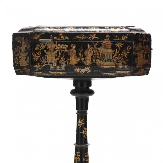 Mid 19th century, having a black lacquered surface with allover gilt and hand painted scenes of landscape, dragons, foliate forms, the case with side handles is raised on a turned standard with scrolled feet. The interior of the case features a removable upper tray, upper small lidded trays, assorted sewing accessories. Two keys are included.