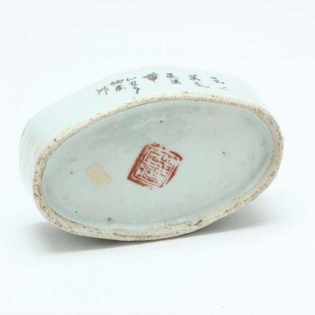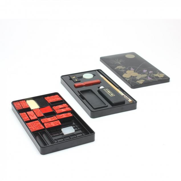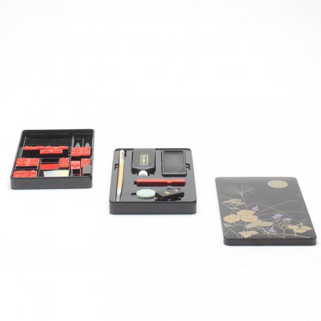 Four pieces including a 19th century Chinese export lidded lozenge form dish, export lidded box, pair of metal shoes, and a Japanese plastic case with ink set.