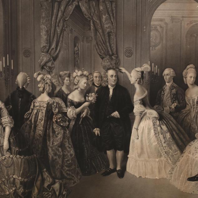 This is one of only two known rare artist's proofs of this popular engraving. Distinguishing characteristics of the proof include Geller's pencil signature, use of chine-collé, and the lack of title lower margin. This lively scene illustrates Benjamin Franklin visiting the Court of France. Here, they celebrate the signing of the Treaty of Alliance, where France promised potential future backing to America during the war against Britain.
