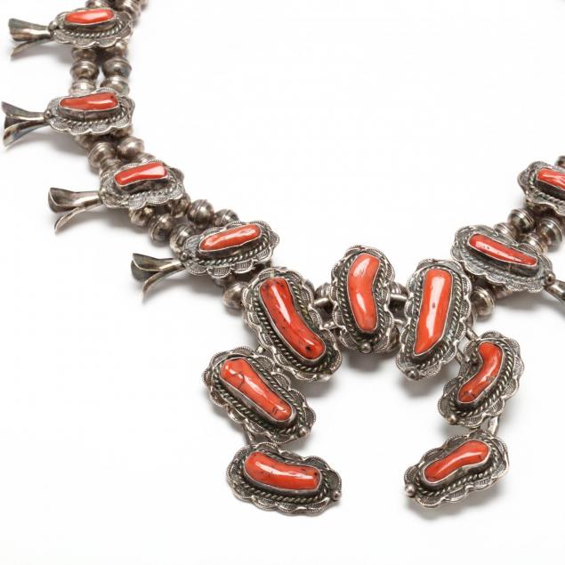 Centered with one naja with multiple bezel set coral tube form cabochons with shaped silver surrounds suspended from a double strand bead necklace featuring ten coral set blossoms and terminating in a lobster clasp marked 925, signed.