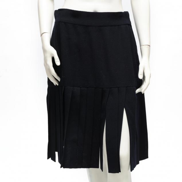 'Midnight' colored wool with a fitted waist and hip, knife pleat skirt, silk lined, Chanel fabric label, zipper and hook and eye rear closure.