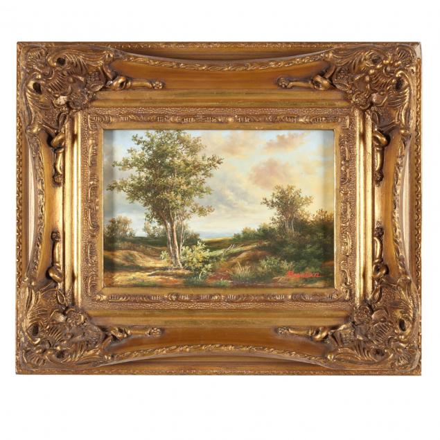 Oil on panel, 20th century, indiscernible signature lower right, presented in gilt frame, retains English framer's label to backing.