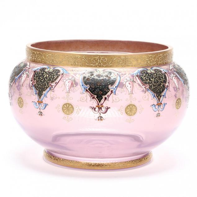 19th century, pink opalescent glass with gilt and enamel floral decoration, numbered to underside.