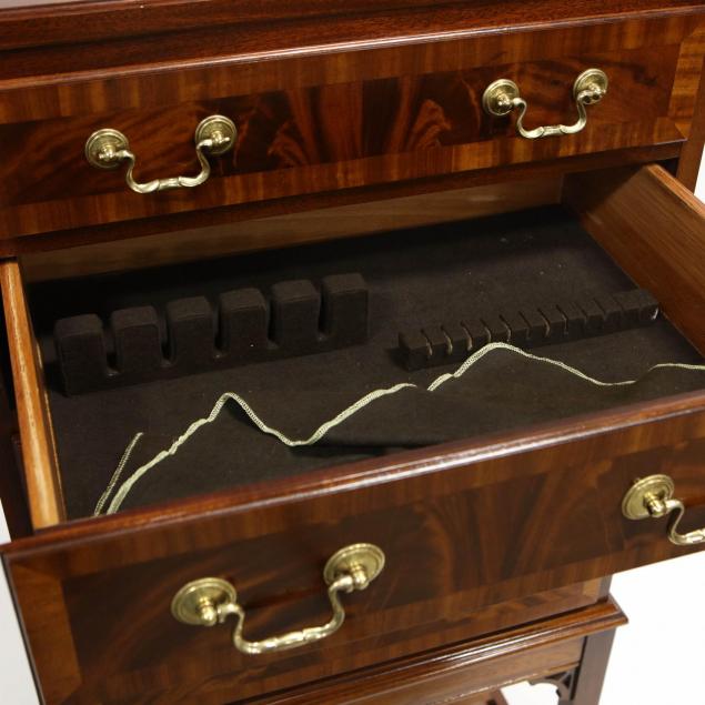 In the 18th century style with mahogany veneers and brass handles, side lock, four graduated drawers with silvercloth linings.