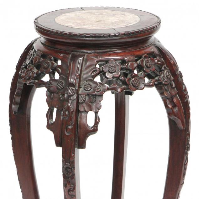 Contemporary circular form with marble inset top encircled by wood panels and wooden square detail around the edge, with pierced floral skirt with cascading plum blossoms, on stretcher base.