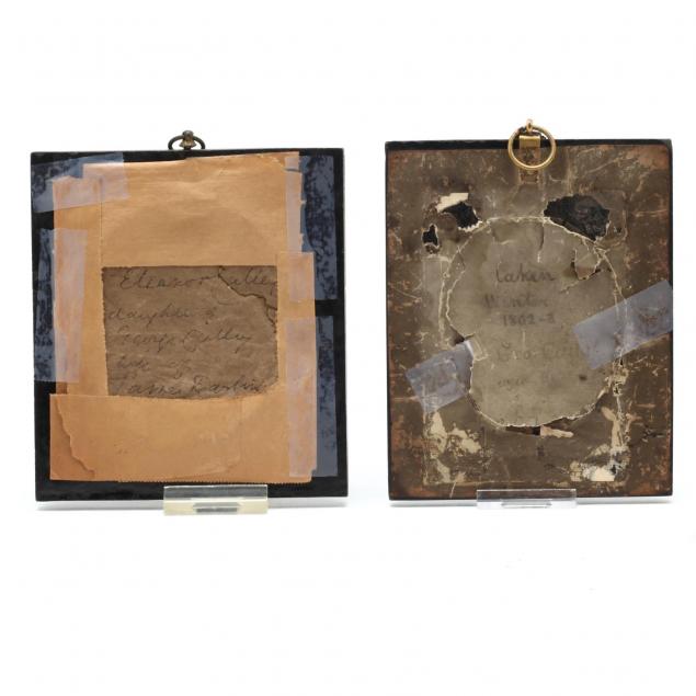 First quarter of the 19th century, both watercolor on ivory, the first a half length portrait of a woman identified on early paper backing as "Eleanor Sulley / daughter of George Culley / wife of James Darling," presented in painted black and églomisé frame (SS 3 x 2.25 in.: DOA 5.5 x 5 in.); the second a quarter length portrait of a gentleman identified on paper backing to frame as Geo Culley, ink inscription reading "Taken Winter / 1802 3 / Geo Culley / aged 68," housed in painted black frame (SS 2.75 x 2.25; DOA 5.5 x 4.5 in.).