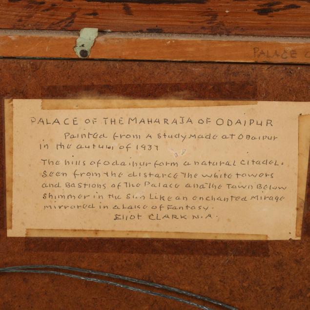 Painted from a study made at Odaipur (sic) in the autumn of 1937. The hills of Odaipur form a natural citadel. Seen from the distance the white towers and bastions of the palace and the town below shimmer in the sun like an enchanted mirage mirrored in a lake of fantasy. Eliot Clark N.A.