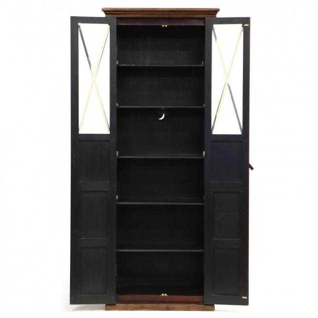 Late 20th century, one-part form, two hinged vertical doors with upper glazing and lower caning, shelved interior, raised panel sides.