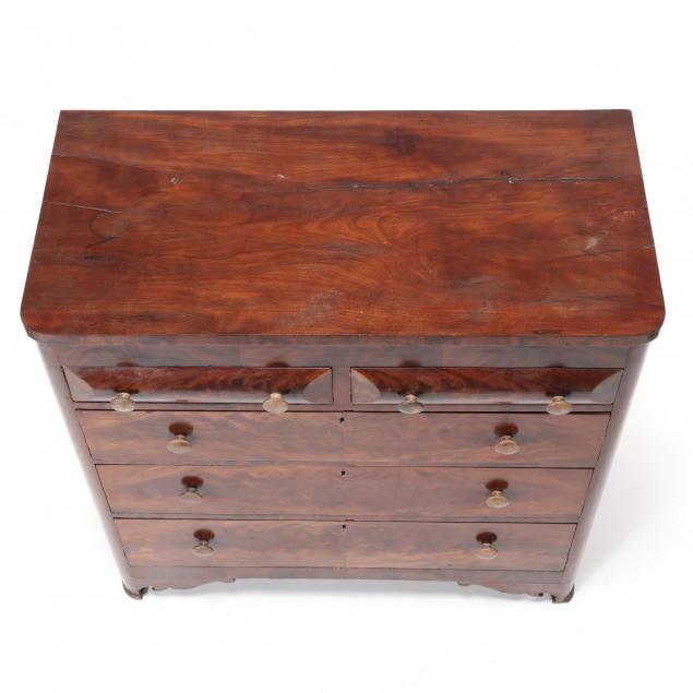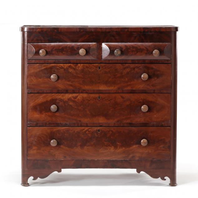 Caswell County, North Carolina, circa 1850s, highly figured and book-matched mahogany veneers, poplar and white pine secondary, two beveled convex short drawers over three full length flush drawers, the upper full length drawer has later dividers, paneled sides, applied base with scrolled returns and raised pad feet, Signed vertically in black paint on the right inside board, "