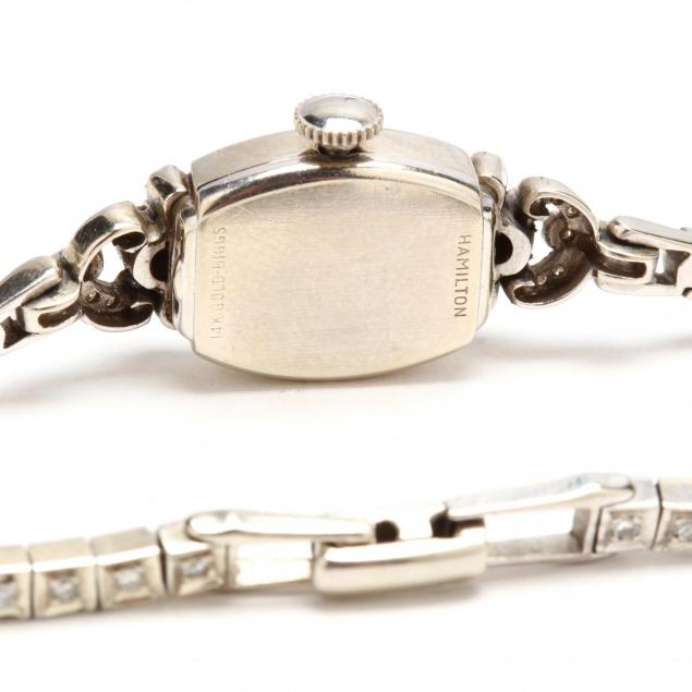 Manual wind with 19 jewels, diamond accented case with two round brilliant cut diamonds and (28) single cut diamonds and with signed ivory dial with applied hour markers, completed with diamond set lugs and square link diamond set bracelet having (48) single cut round diamonds, works signed Hamilton / 756. Total diamond weight of approximately 1.20 total carat (G-H color, VS clarity).