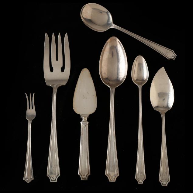 (43) pieces including: (4) knives, (4) forks, (4) salad forks, (1) pie fork, (4) fruit spoons, (3) iced tea spoons, (5) round soup spoons, (5) teaspoons, (4) seafood / cocktail forks, (3) tablespoons, serving fork, jelly server, butter knife, olive spoon, cheese server, and one non-matching lemon fork. "D" monogram.
