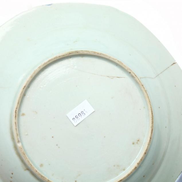 Repaired area to corner of large platter; hairline cracks to five; rim chips to five; general wear and staining.
