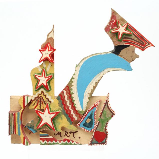 Acrylic on wood to include: a bird ornament (initial signed); a turtle; Santa and Rudolph construction, signed on the back (4.5 x 15 in.); and a white star and Indian work ART(11.25 x 9 in.)