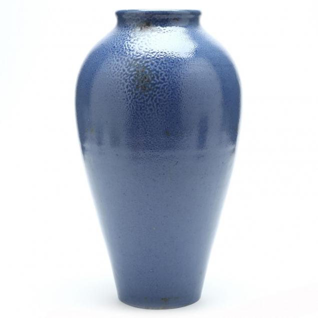 1930s, stoneware with cobalt glaze, glaze probably by C.B. Masten, the tall vase is a lamp base with original wire hole.