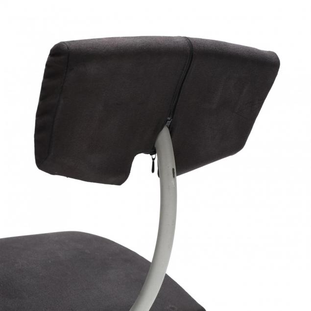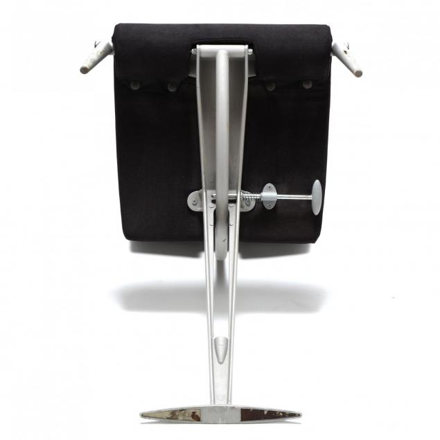 1994, powder coated aluminum frame, black canvas upholstery, adjustable back for either a chair in the sitting or kneeling position, marked.