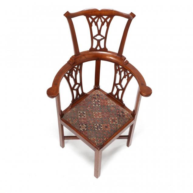 Rare corner chair form, good pegged mortise and tenon joint construction with rose head nails to corner blocks.