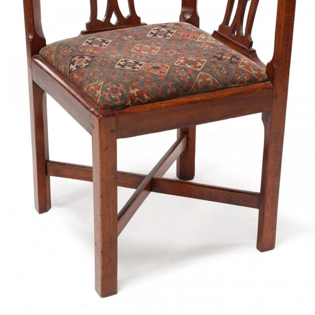 Late 18th century, mixed woods, shaped upper crestrail above three pierced backsplats, chamfered straight arm supports, slip seat with later flat weave upholstery, straight legs with inside chamfer, on X stretcher base.