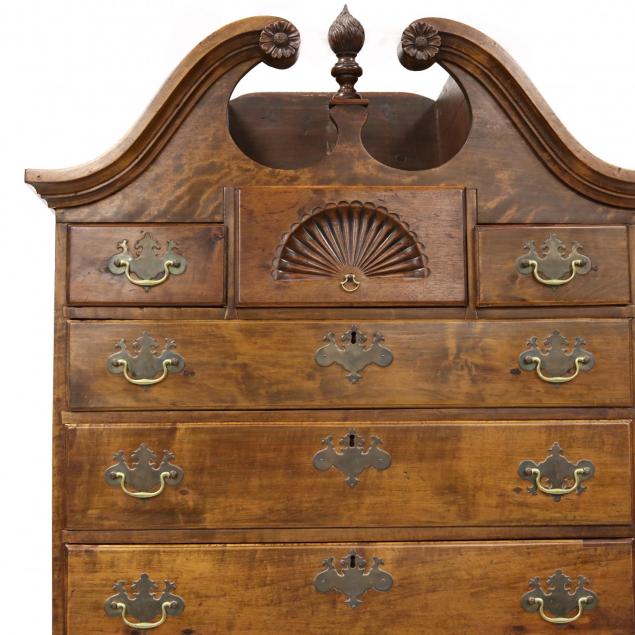 18th century, maple, white pine secondary, two part form, bonnet with rosettes and replaced flame finial, upper and lower central drawers with relief carved fan, graduated lipped drawers, cabriole legs with pad feet.