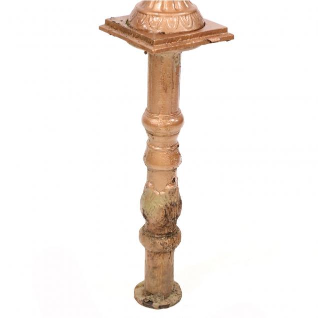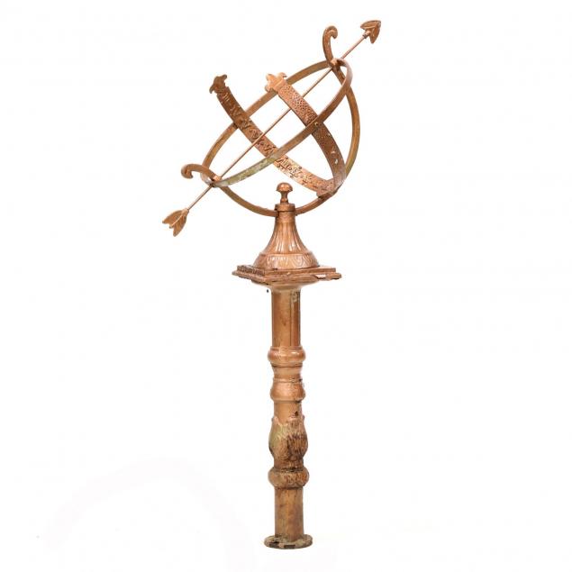Mid to late 20th century, iron base with a later aluminum armillary sundial, appears unmarked.