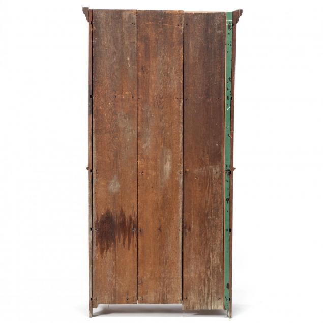 Piedmont region, early 19th century, walnut, yellow pine secondary, one piece form, applied cove molded cornice, two upper paneled cabinet doors with shelved interior, waist with an applied molded edge above two paneled cabinet doors, shelved interior, flush sides with straight bracket feet from the solid.