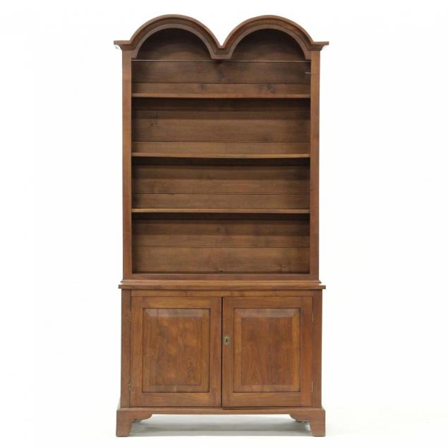 With burned label to each piece to "Made By McSwain's of Charlotte 1977", walnut, two part form, upper bookcase with double molded arch, open shelved interior, base with two raised panel hinged doors, shelved interior, the whole raised on shaped bracket feet with spurs.