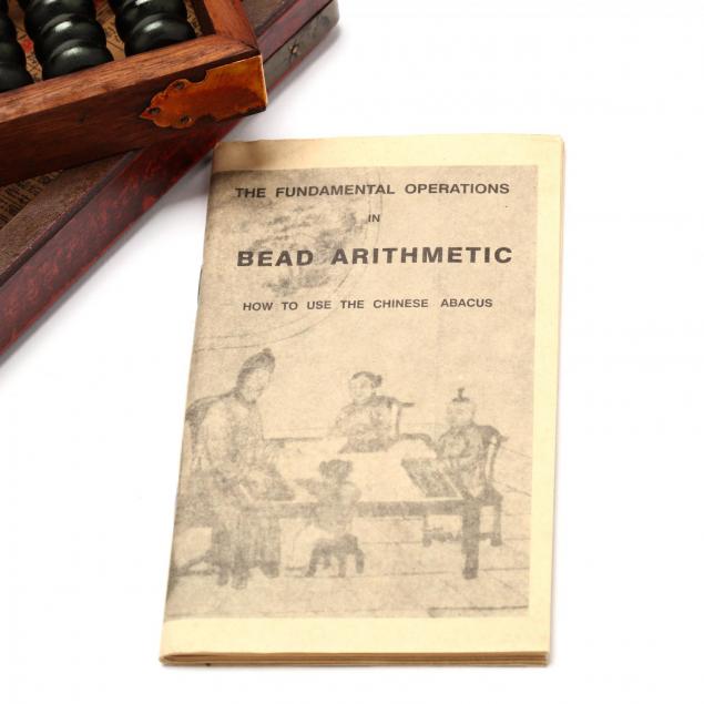 Includes a red lacquer box with painted figures in a courtyard scene on the top, inside is a wooden abacus, and a black lacquer hand held fire screen with painted decoration.