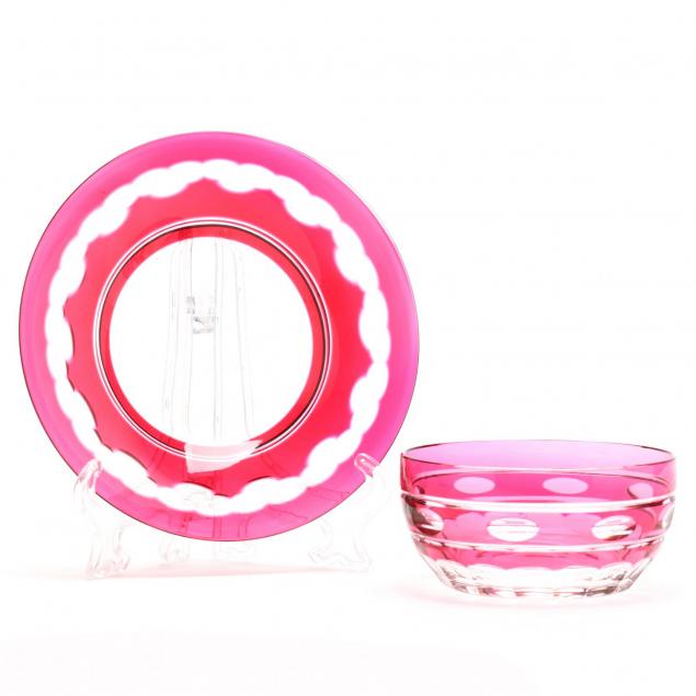 Including: (12) goblets (5.75 in.); (10) sherbets (4 in.); (10) dessert wines (4 5/8 in.); (8) coupes (4.25 in.); (10) under plates (6.25 in. diameter); (12) finger bowls (4 in. diameter); and (3) pedestal bowls (tallest 6 in.), signed.