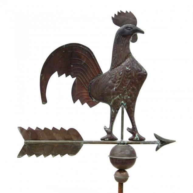 Late 20th century, copper hollow bodied rooster, iron mount, brass directionals and copper spacers.