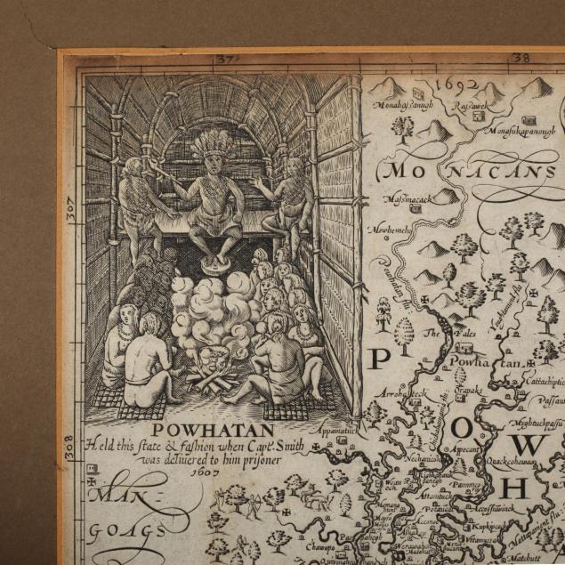 Purchas His Pilgrims, book 9, volume 4 (London: William Stansby for Henrie Featherstone, 1625). This map has the State 8 additions of the place names "Feathersones Ba ye," "Bollers bush," and Sparkes Poynt" plus "Page. 41/Smith" in the lower right corner; State 9 diagnostics present include the extended "A" in Appamatuck and the addition of "Washebonne C." above the ship offshore. Presented in a later gilt frame.