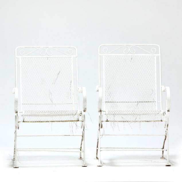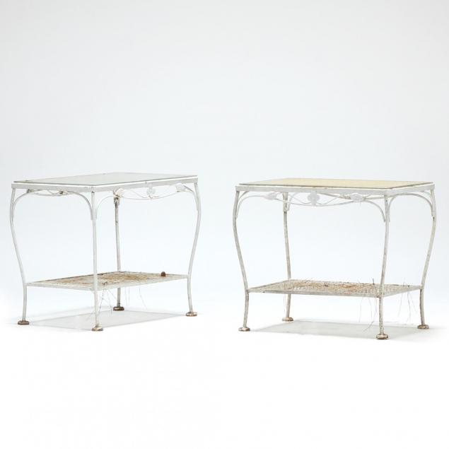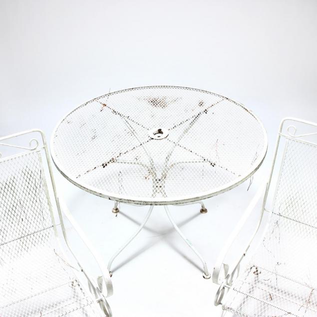 White painted surface, including four arm chairs, circular table and two rectangular side tables with glass tops.