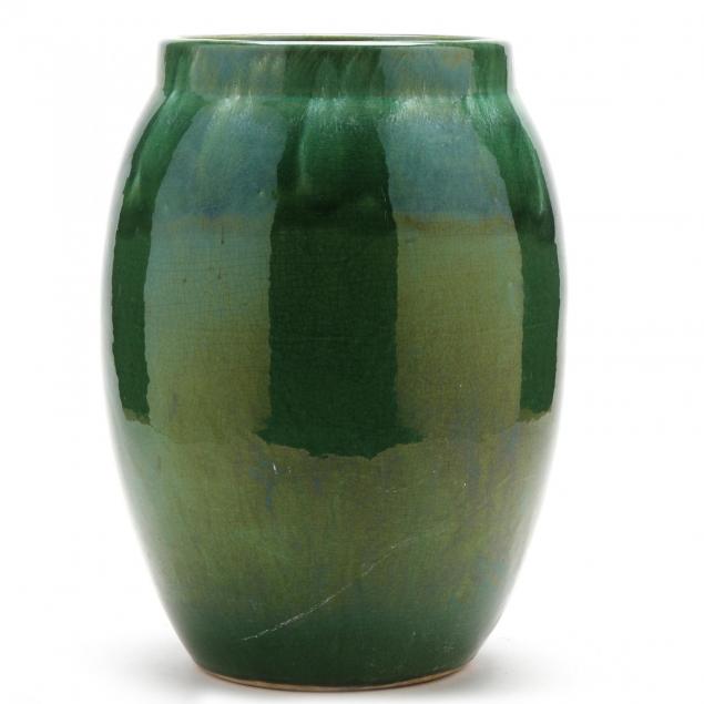 Circa 1940, green glaze, elongated baluster form with drain holes to underside, possible faint stamp to underside.