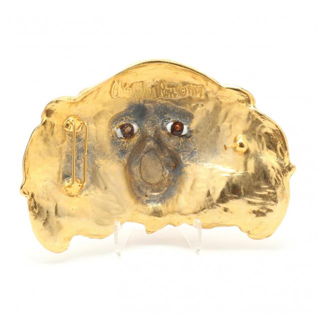 signed and dated on the verso 1984, gold plated with glass eyes glued in place. With tan leather belt signed on the inside.