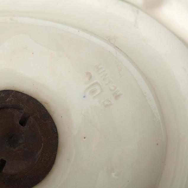 Impressed date mark of 1853, celadon and clear glaze, modeled with two putti in the process of decorating a fluted Doric column with floral garlands and blossoms, raised on scrolled acanthus feet.