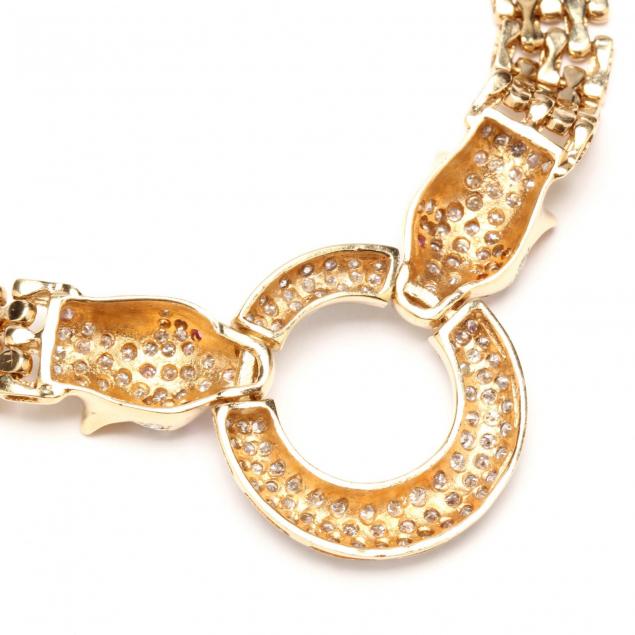 Necklace centered with a diamond set ring with two confronting diamond set panther heads accented with ruby set eyes, completed with an integrated box clasp marked 14KT, the (152) round brilliant cut diamonds weigh approximately 3.82 total carats (G-I color, I1 - I3 clarity).