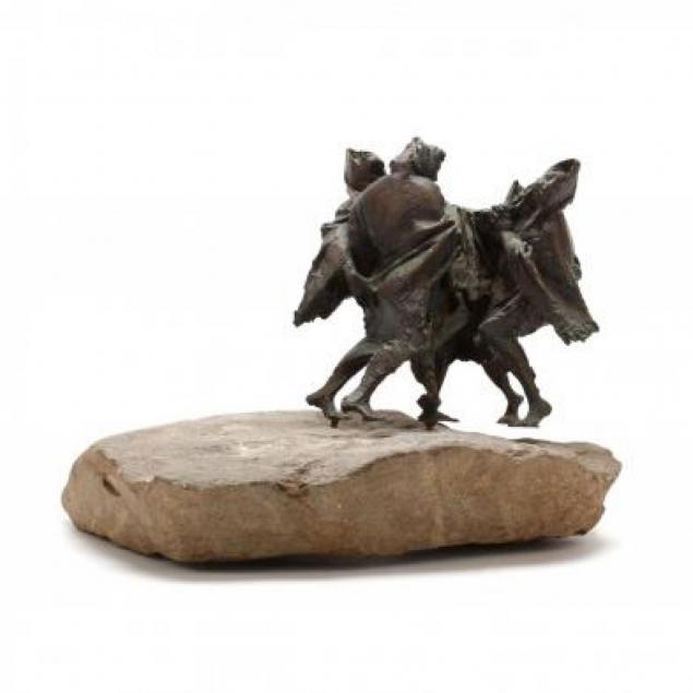 Bronze figural group mounted to a chiseled stone base, signed on one foot, designed in 1963.