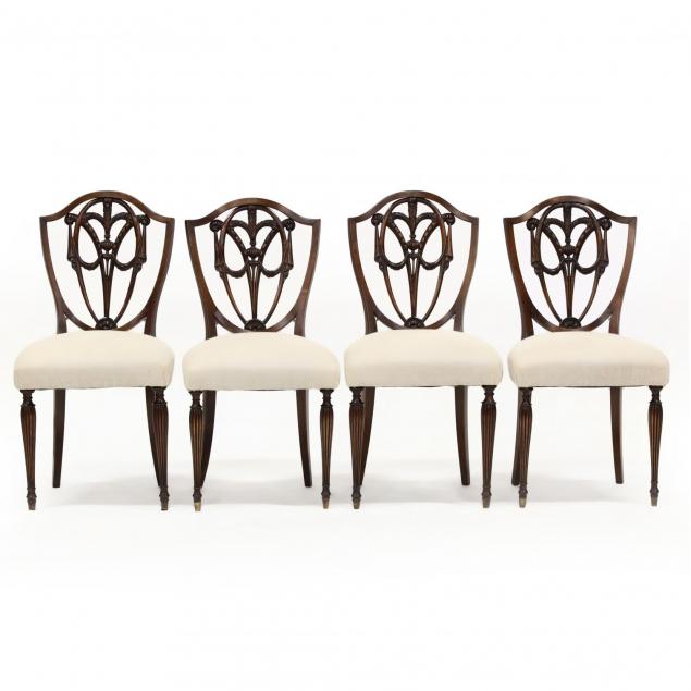 Early 20th century, mahogany, all side chairs, shield back featuring Prince of Wales plume, contemporary over upholstered seat, on reeded tapered legs, with brass caps.