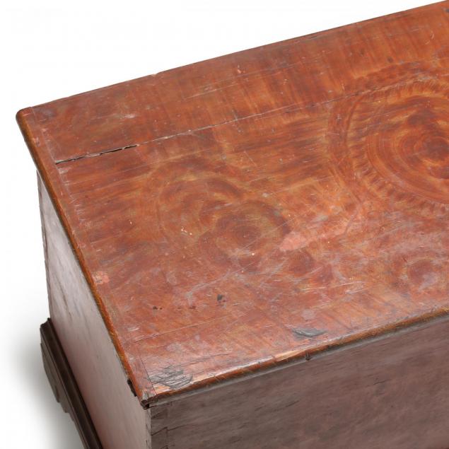 Early 19th century, white pine, dovetailed case and feet, top with applied molded edge featuring a folky swirl painted grain, old iron fish tail hinges, opens to reveal an interior with hinged lid till and drawer, over a long drawer, raised on straight bracket feet with talon.