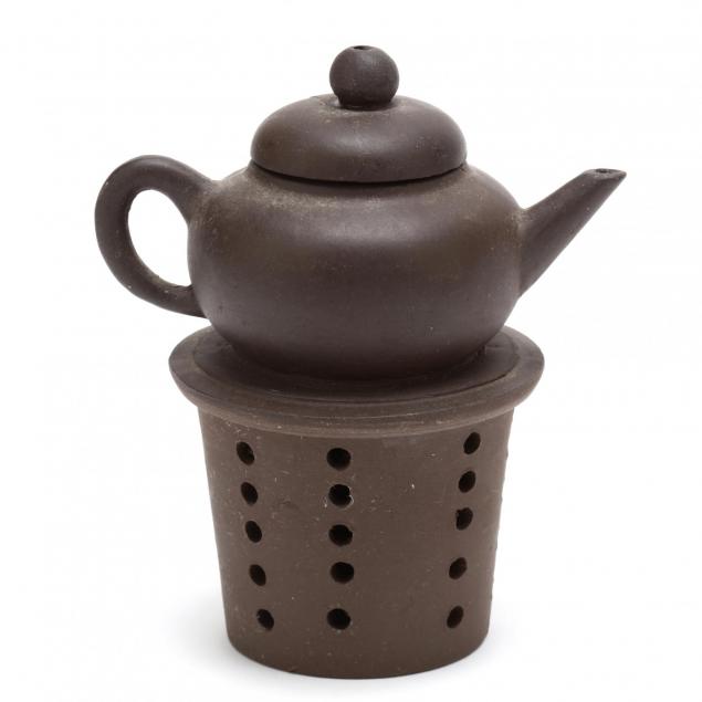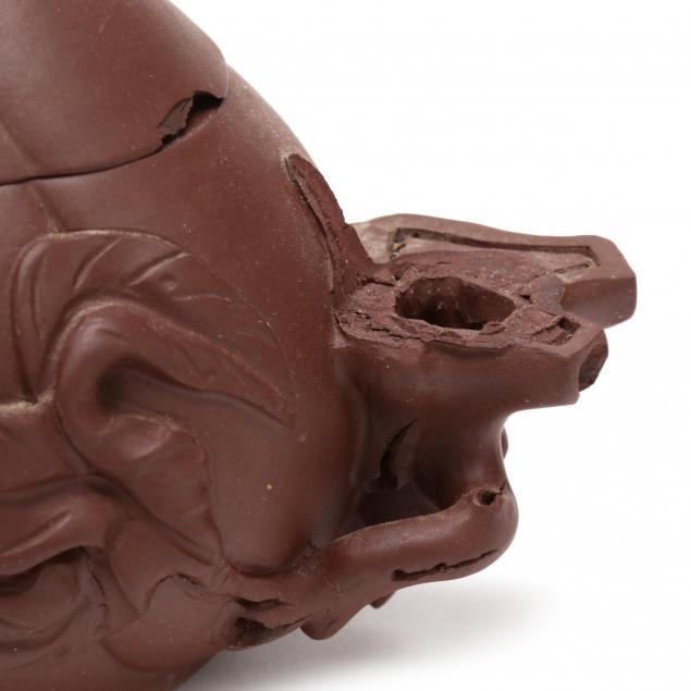 In various shapes and styles, all with marks to the under side, one is a half moon shape with cicada on cover (3.75 in.; some dirt; a few chips to base), one is a gourd shape with peach on lid (4.25 in.; broken handle; multiple chips to the lid), and one with a double teapot decoration and tea leave holder connected to lid (7.25 in.; teapot lid has been repaired; white mark to side of teapot.)
