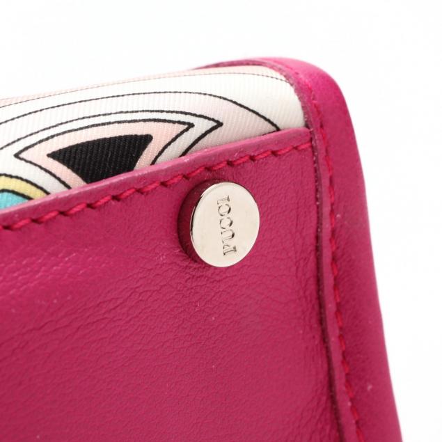 Made in Italy, a silk print handbag with hot pink leather trim, the interior with an integral key ring, cell phone pocket, zip pocket, with dust bag; the second article is a silk scarf having a black field with hot pink detail (33 x 33 in.)