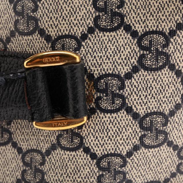 Made in Italy, from the Gucci Accessory Collection, coated navy logo canvas with leather trim, blue and red webbing detail to the front handles, navy leather interior with large zip pocket, removable strap. With dust bag.
